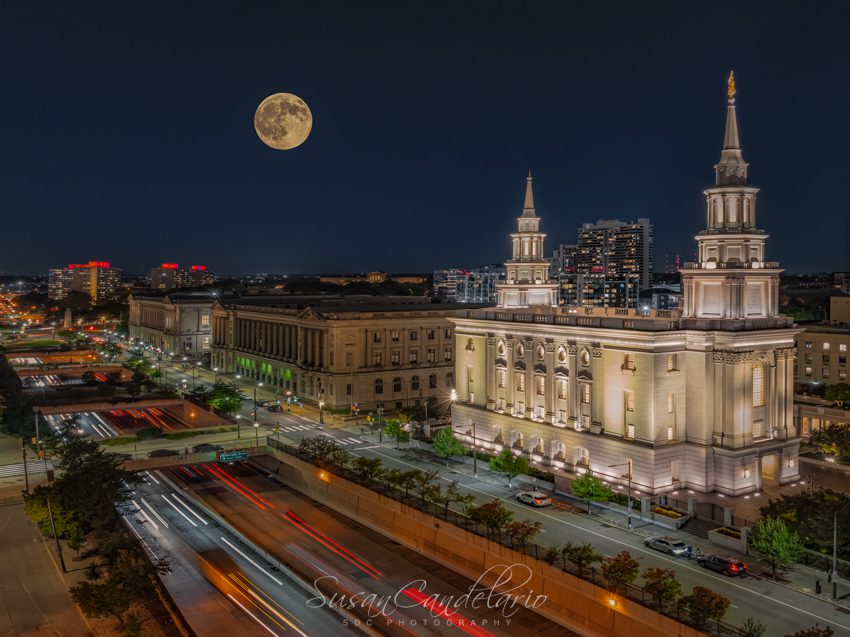 The second image, “Philadelphia Pennsylvania Temple,” offers a wider view and a different kind of energy. Here, the moon is less of a dominant force and more of a majestic feature within a bustling cityscape. The illuminated Philadelphia Pennsylvania Temple serves as an anchor, its bright architecture contrasting with the streaking tail lights of the traffic on the adjacent highway. This long-exposure element introduces a dynamic, fleeting motion to the otherwise still night. The moon hangs calmly above, a silent, steady observer of the city’s nightly rhythm.