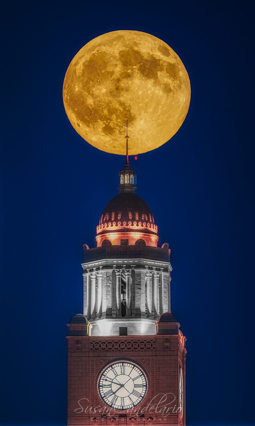 An incredible view as the massive, Harvest Supermoon seems to balance perfectly atop the spire of the historic old Inquirer building clock tower. The deep indigo twilight sky and the illuminated architecture provide a striking contrast to the moon’s golden glow. A true moment of celestial and earthly alignment.